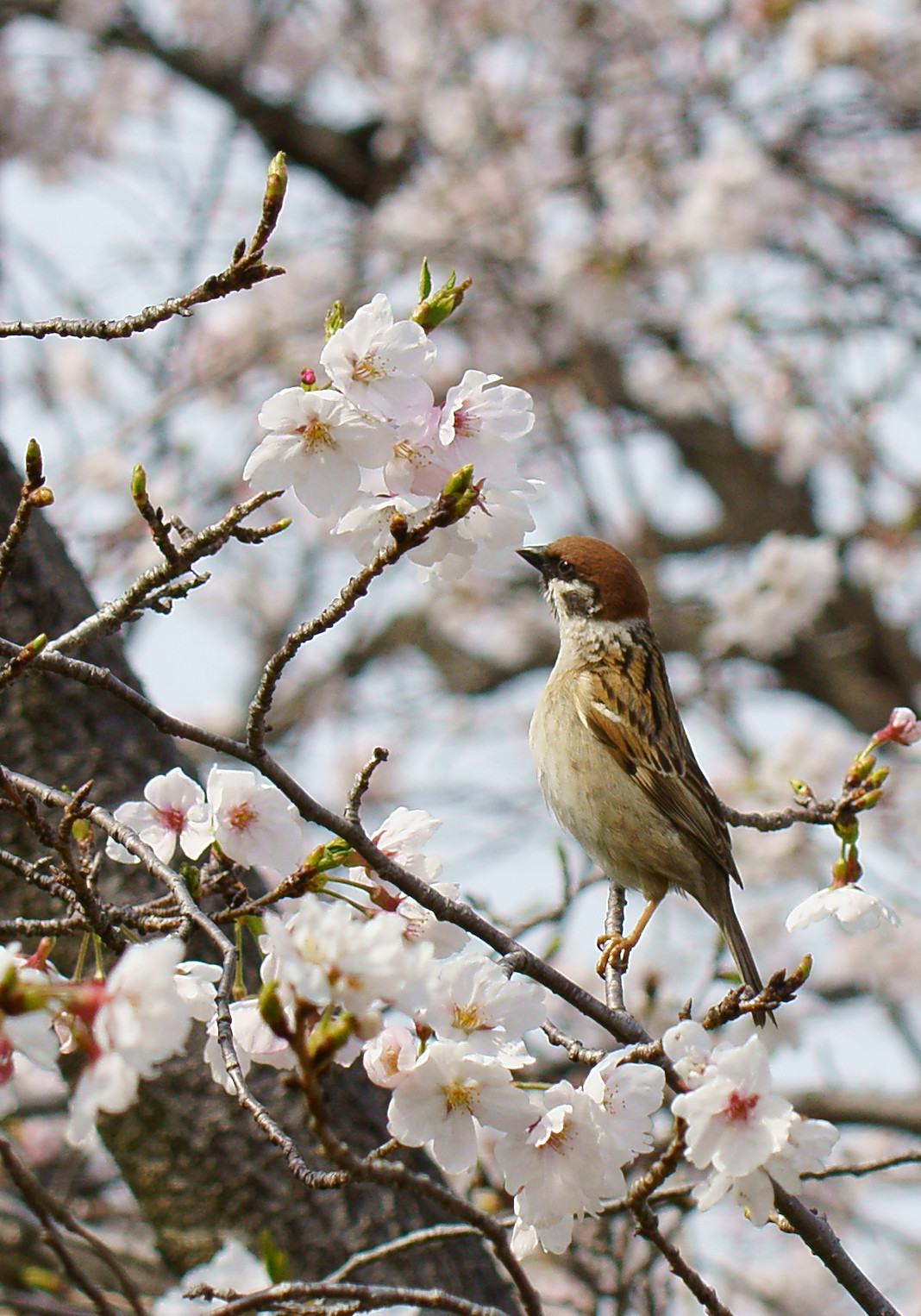 桜とメジロならぬ、桜とスズメ。 この後、花芽(?)をくわえて木のうろへ入っていきました。 子育て中?
