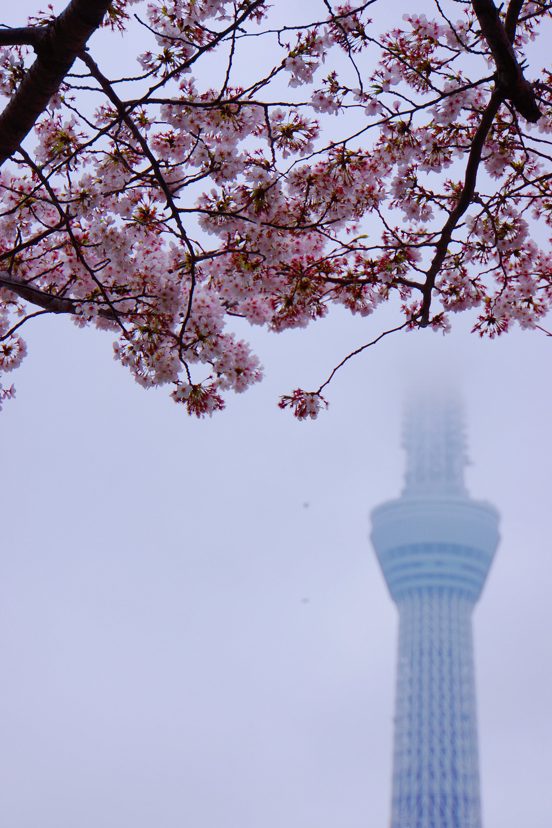 桜も季節を間違えてしまいそうなこの寒さ。対岸のスカイツリーも雲の中。
