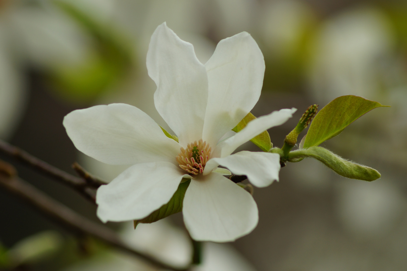 木蓮の花弁は雨風に逢うと茶色に傷つきなかなかきれいな花をみることができないのですが今咲いたばかりの花を見つけました。