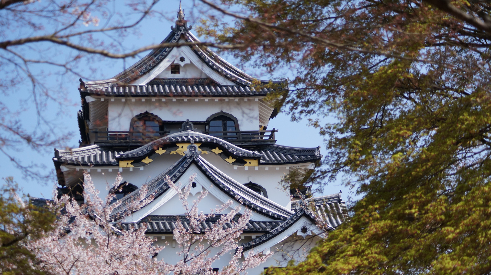 撮影時、彦根は快晴で、気持ちいい日でした。 望遠を使い、木々の間から撮影をしました。