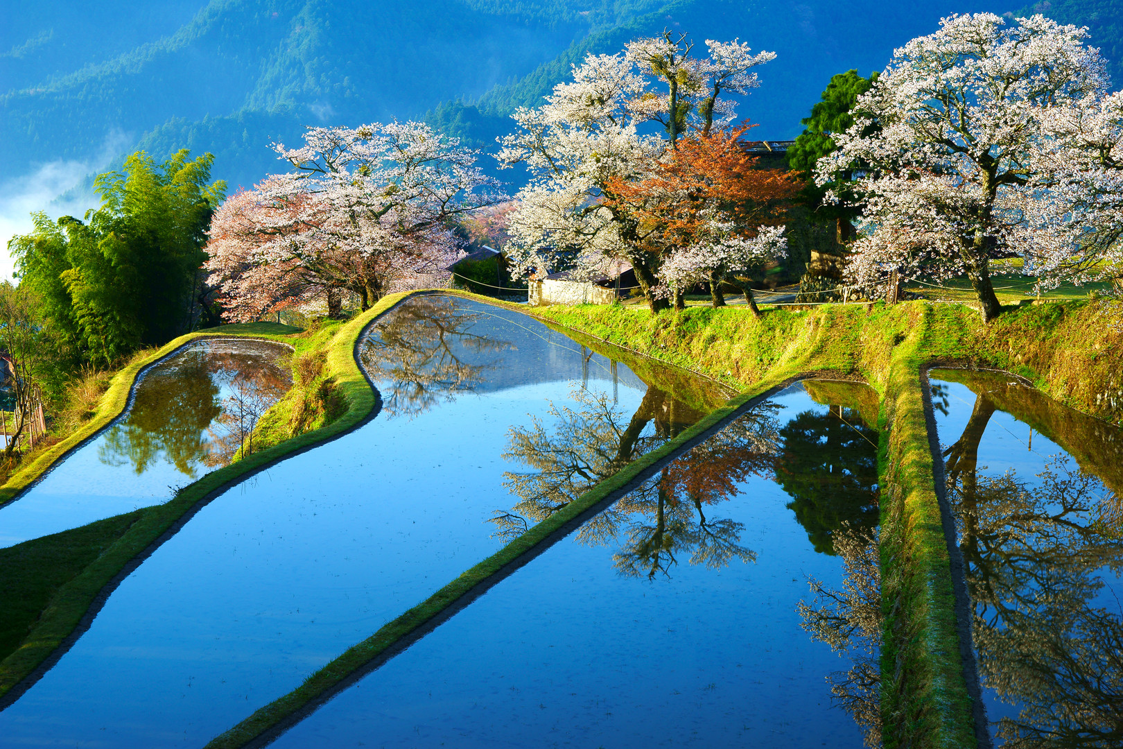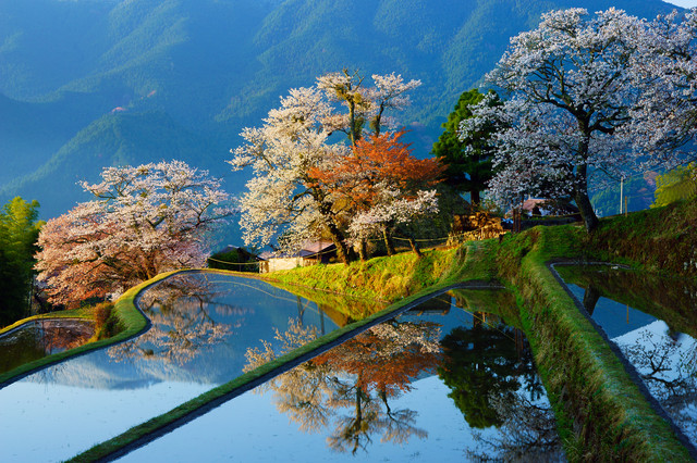 超有名撮影スポットの三多気の桜です。 ここは撮影出来る足場が下から上まで5段ほどあり、いろんな高さ、角度から撮れます。1枚目は2段目、2枚目は3段目です。平日の早朝に関わらず50人以上のカメラマンが来られてました。みんなさん好きですね〜^^;