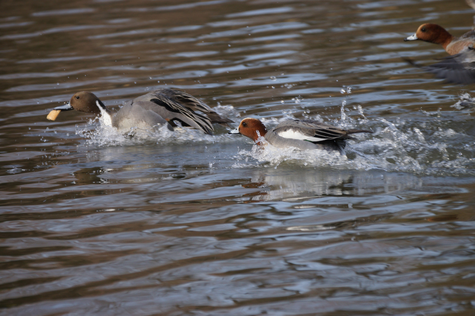 俺によこせとばかりに餌の取り合いで追いかけっこするカモたち