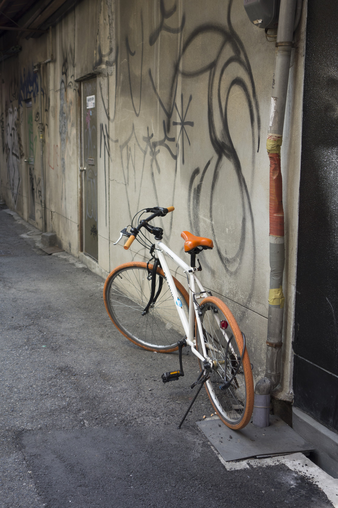 殺風景な景色に自転車のオレンジが活きている。