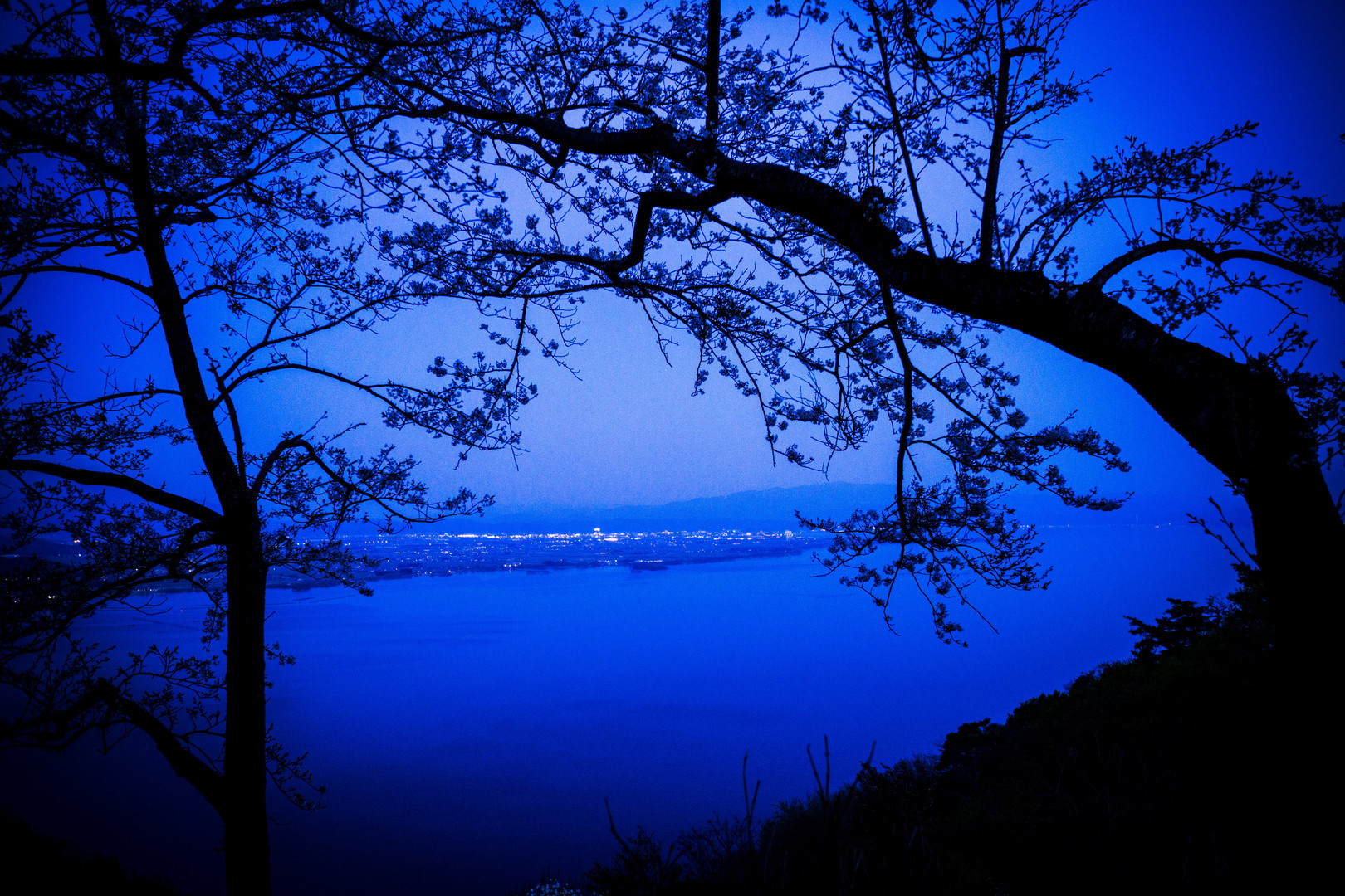奥琵琶湖パークウェイの展望台の桜の樹の間から臨む 雄大な琵琶湖とその向こうに瞬く街の灯り 琵琶湖オフ会の桜のアップをとのご要望にお応えして・・・