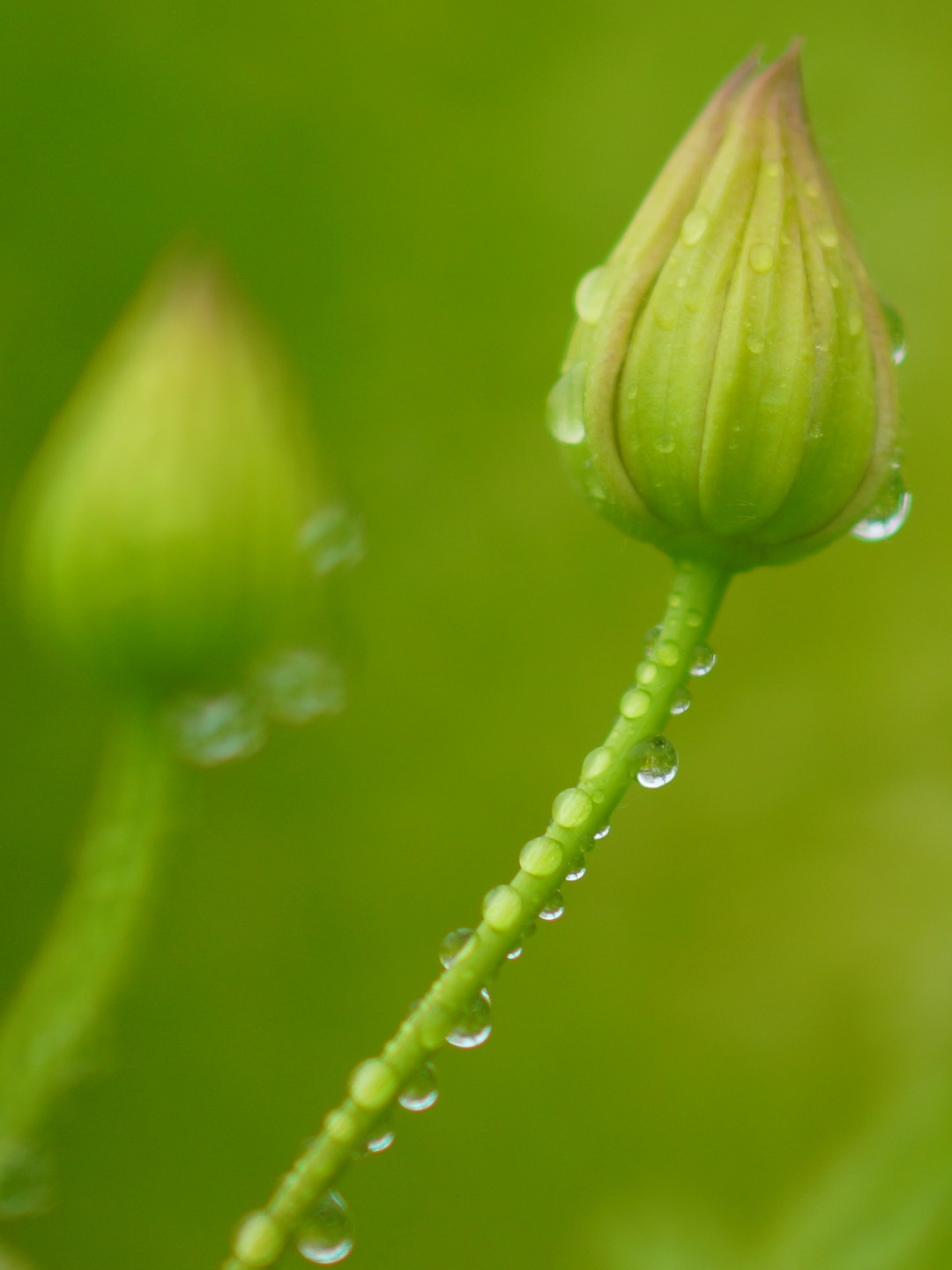 クレマチスの蕾と茎に付いた雨粒たち