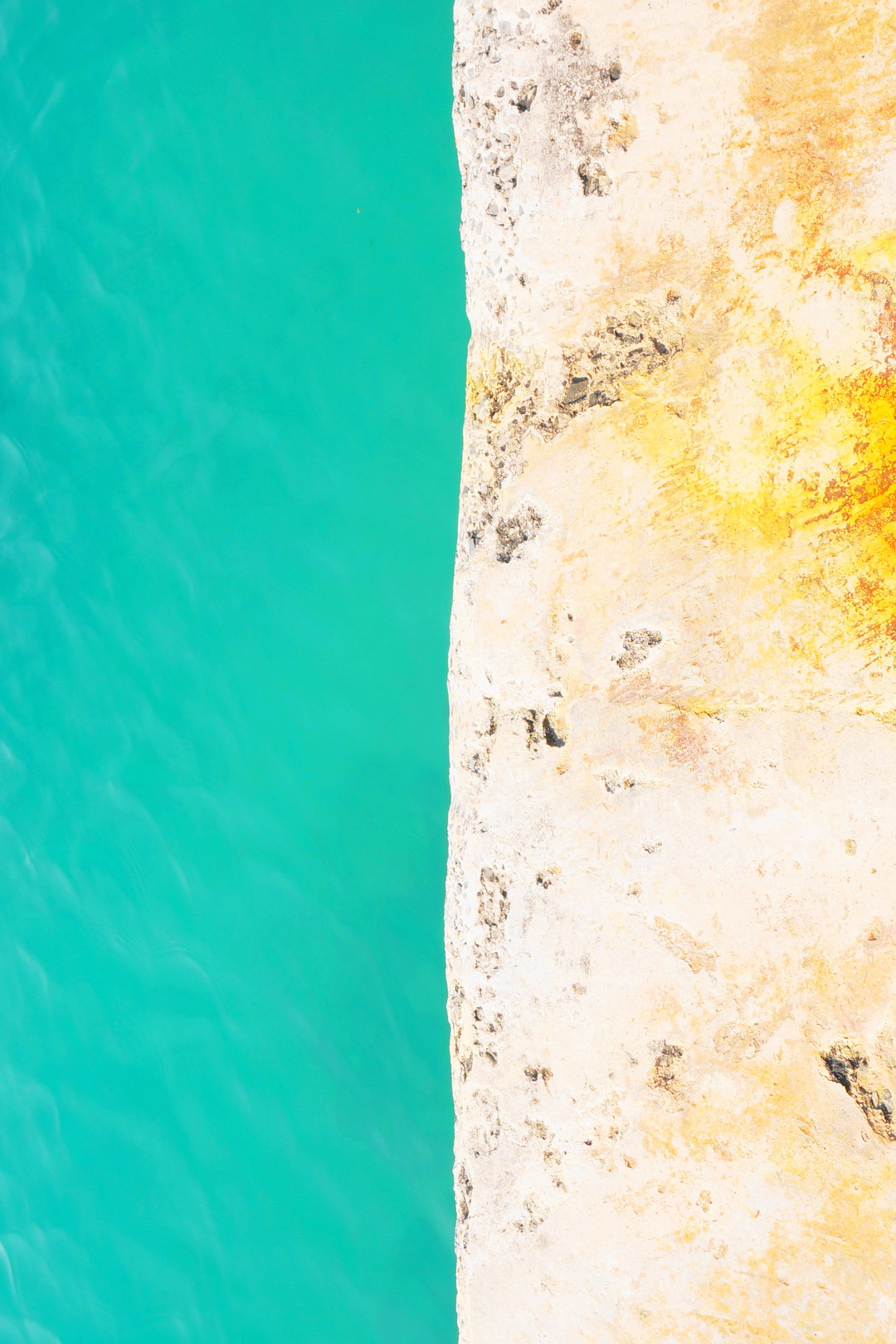 錆び色の防波堤とエメラルドグリーンの海の色