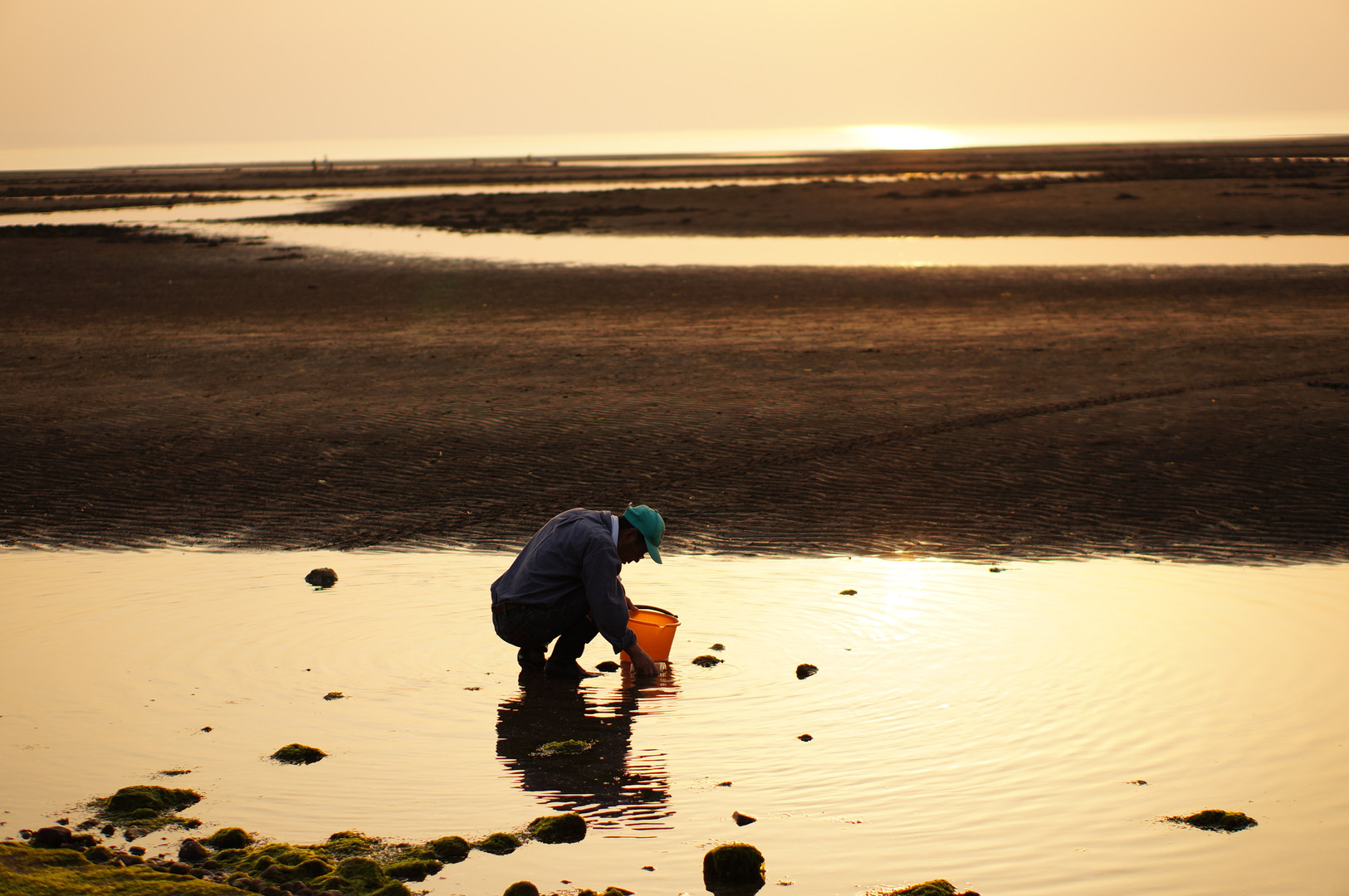 潮干狩りの後の光景。海水を汲んでる様子が印象的で…