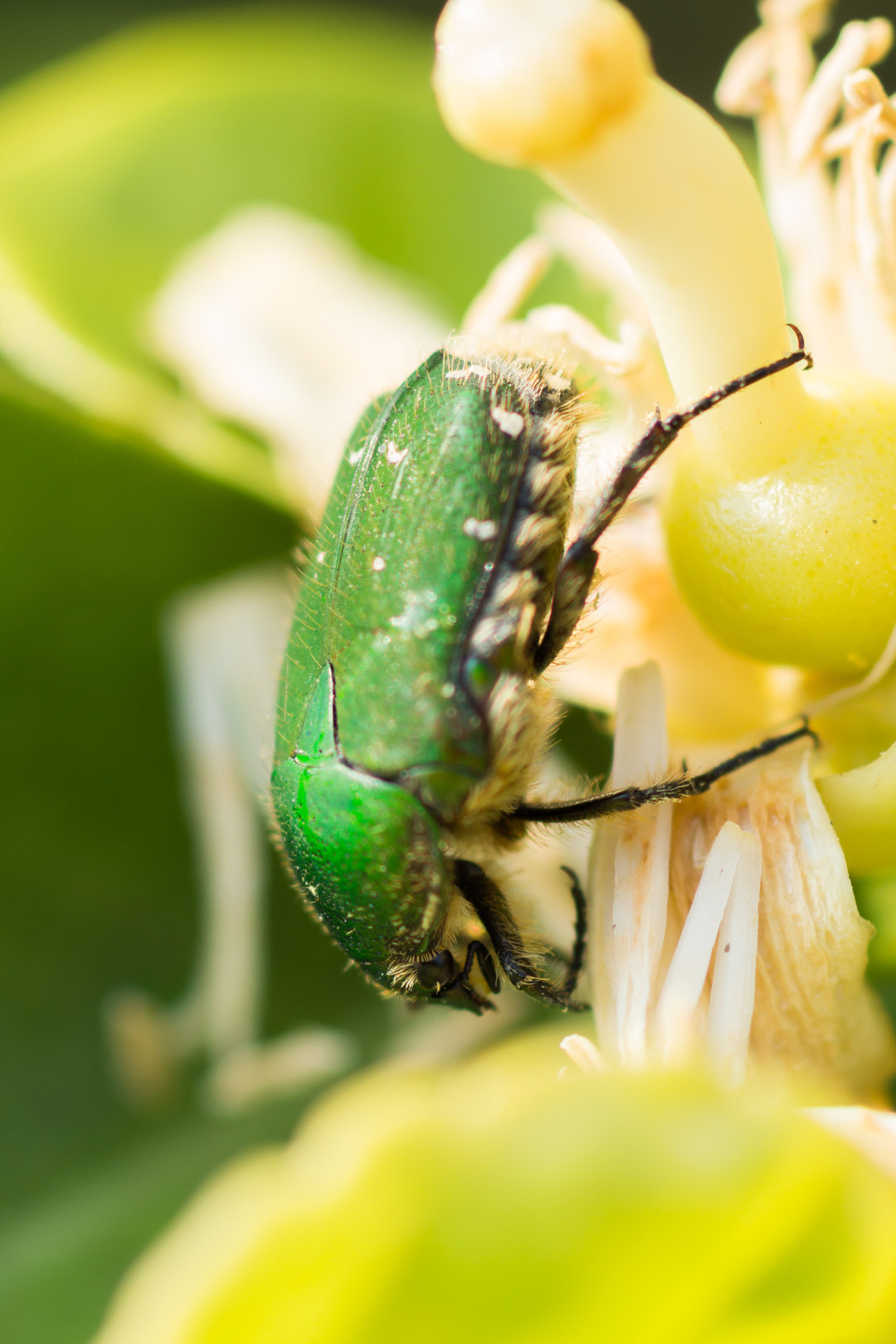 昨日撮ったみかんの花に、さっそくハナムグリが来てました。