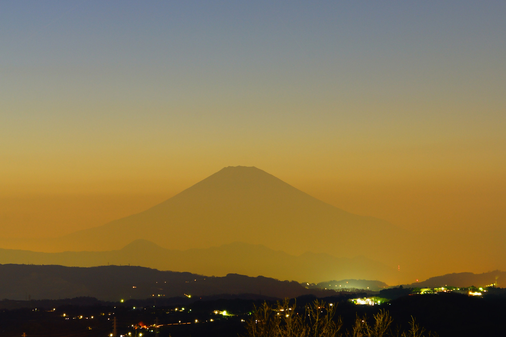 霞がかかった、富士の夕暮れです。