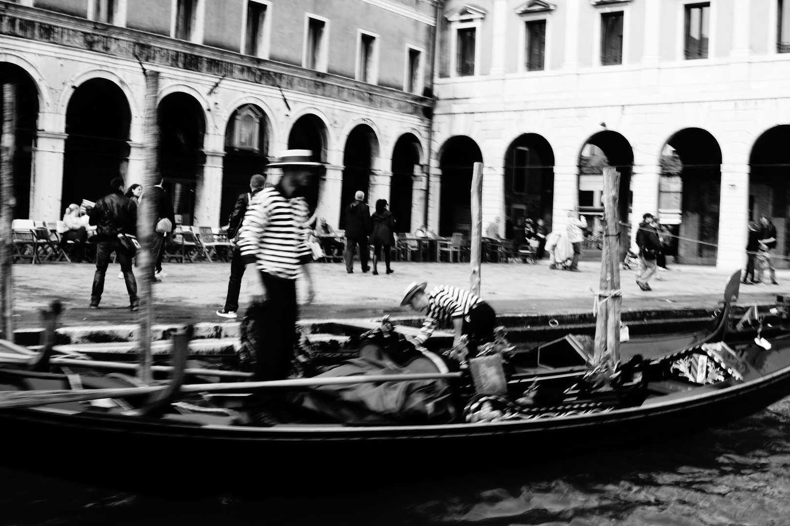 ヴェネツィアにて。忙しそうに準備をするゴンドラ乗り。水の都と呼ばれるこの街を代表する光景であり、彼らは重要な交通機関の役目も担っている。