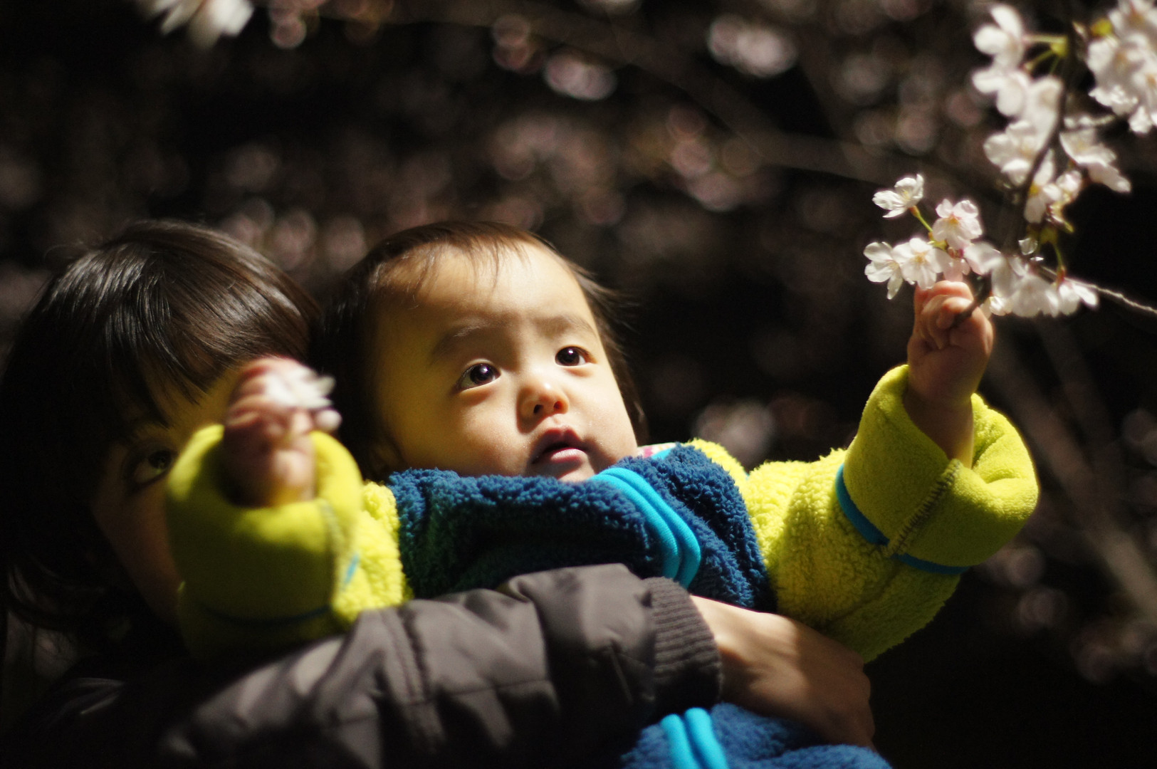 満開の桜が外灯に照らされて瞳の中に・・・・ 初めての息子は何を思っているんでしょうか・・・(^_^;)