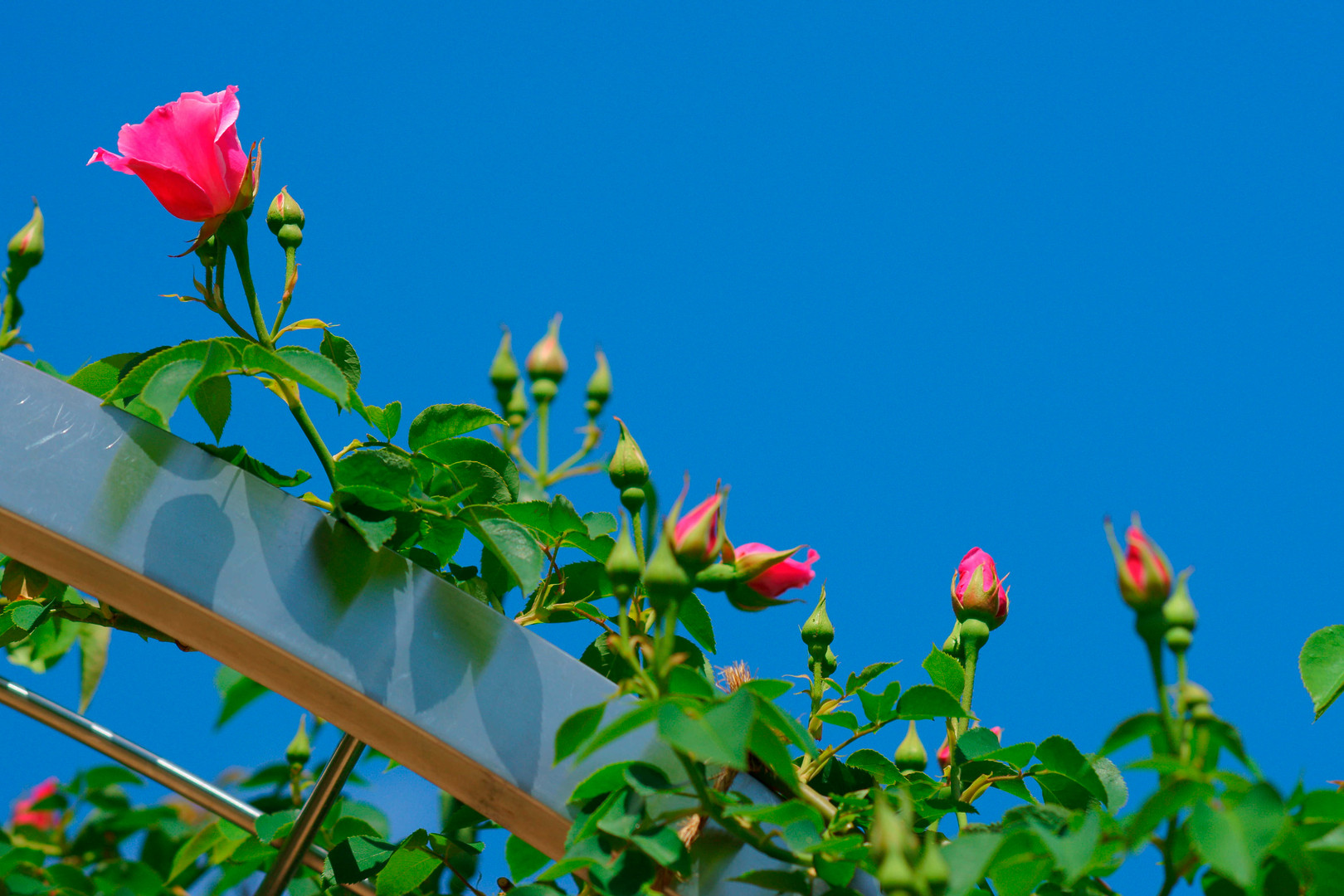 近所のバラ公園のバラが咲きはじめて、青空に向かって輝きはじめていました。
