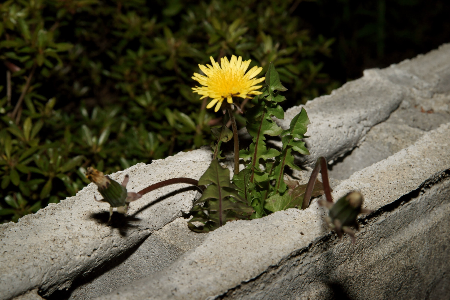 夕暮れに歩いていたら、このタンポポが目に入りました。ブロック塀の上で花を咲かせるなんて
