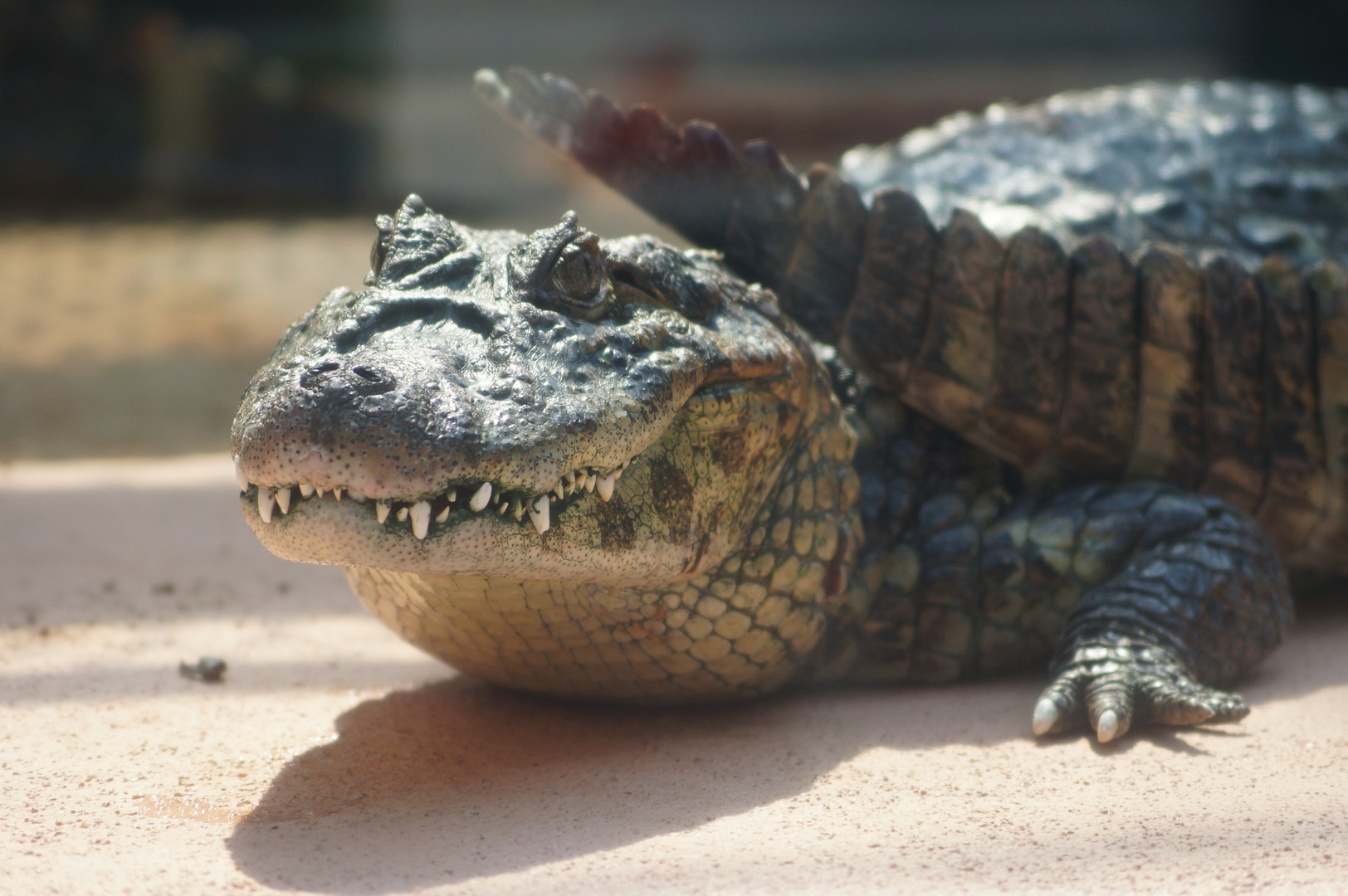 ワニ園で撮影しました。ちょっとビビリながらの撮影です。よく見ると歯の先が丸いのですがお手入れしているのでしょうか。目つきは悪いですが手はかわいいです。