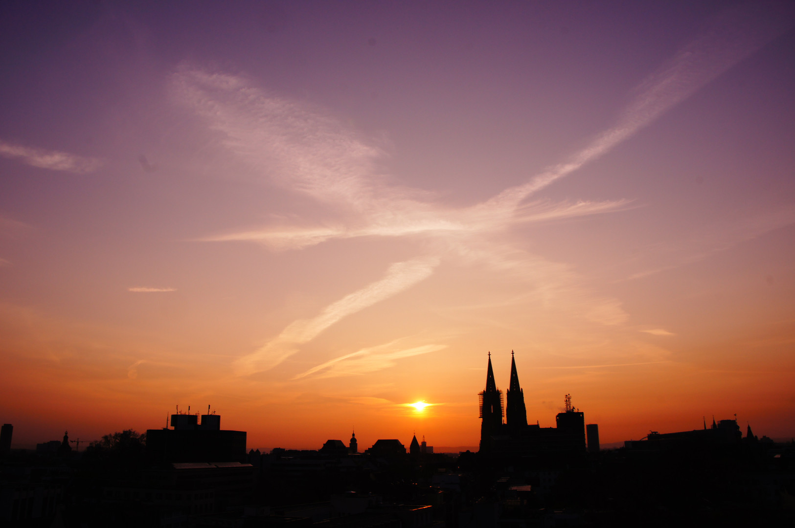 ドイツのケルンです。真ん中右に見える高い2つの棟が世界遺産のケルン大聖堂です。その真上には十字架にみえるように雲がありとても幻想的でした。ケルン大聖堂は教会でもありとても不思議で神秘的です。