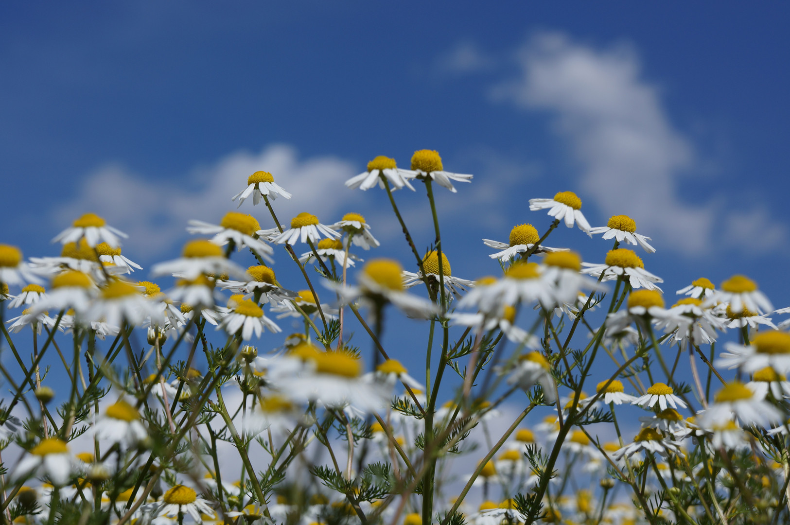青空と空へのびるカモミールがとてもきれいだったのでパシャリ。 天気が良いと撮影が楽しいですね♪