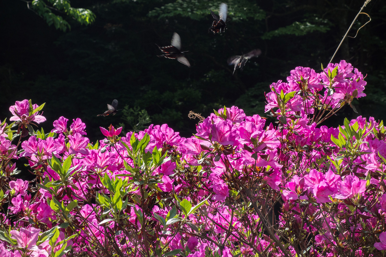 林道脇の数少なくなったツツジの上で、黒いアゲハ蝶が競うように舞っていました。