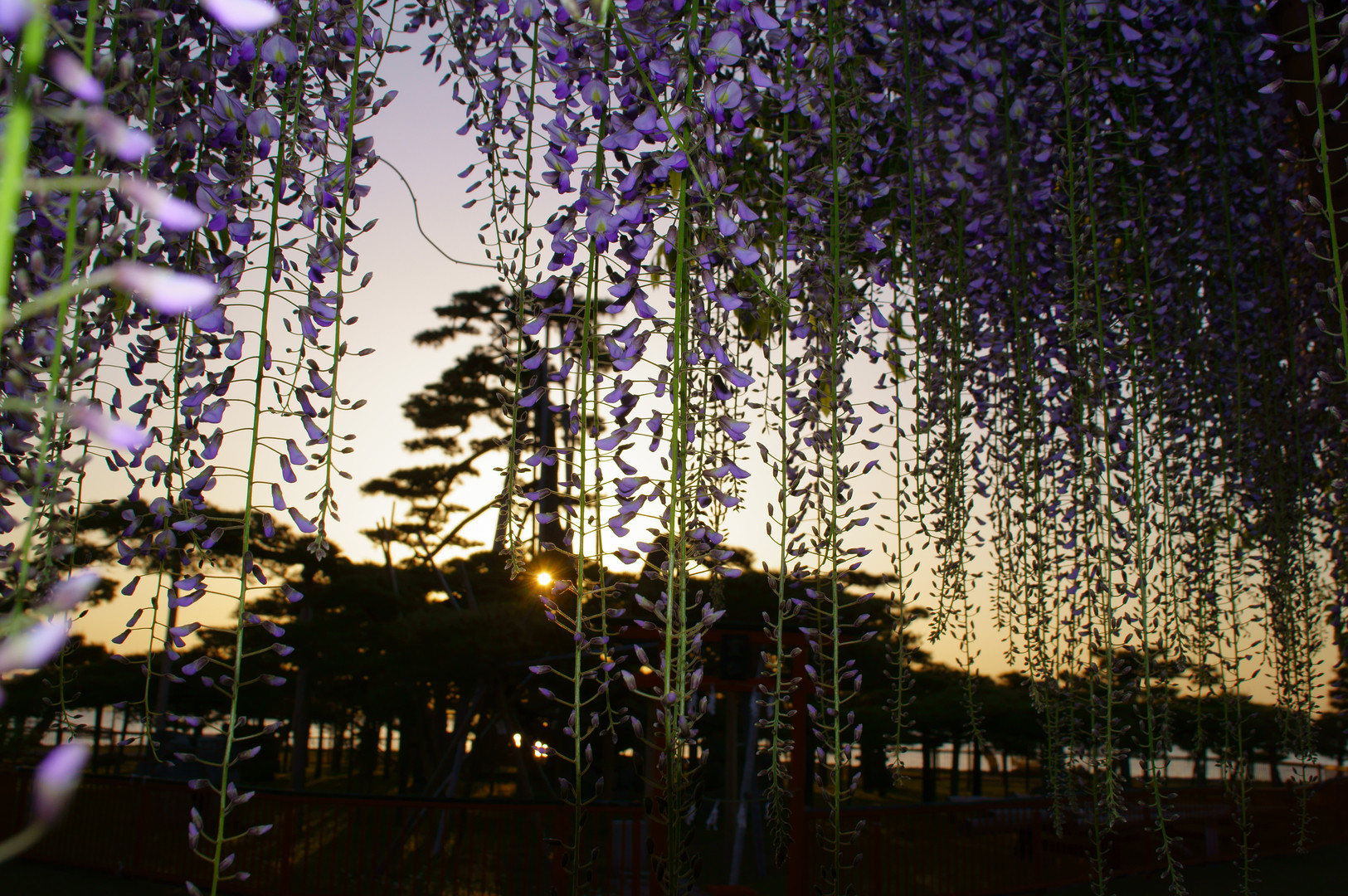 少し前、唐崎神社にて藤棚のなかから日の出と一緒に撮ってみました フラッシュも焚いています。