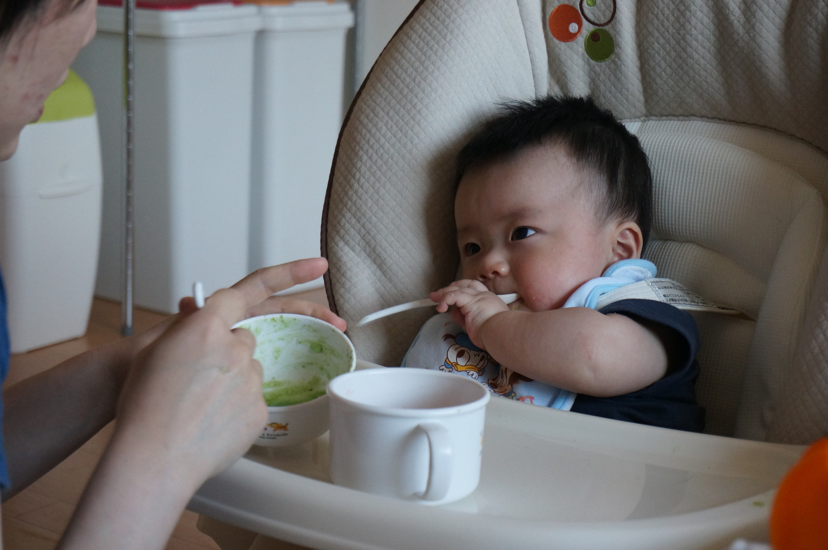 離乳食を食べさせてますが、自分でスプーンを持つようになりました。 ちゃんと食べてるかどうかは別問題ですが(笑)