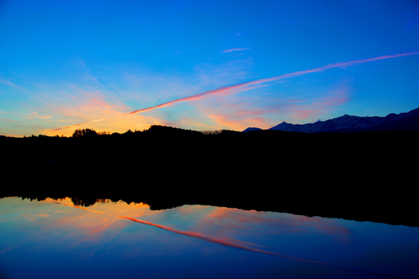 水田に映る朝焼け空と飛行機雲です。 上富良野町にて