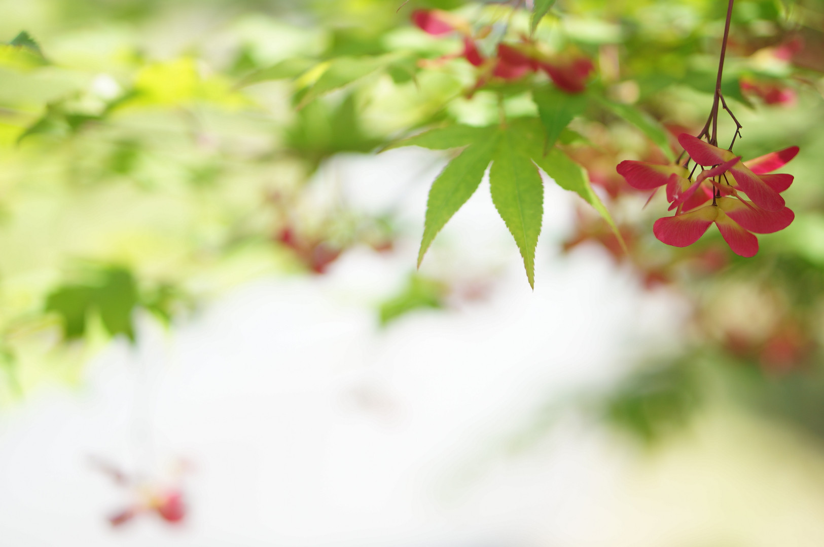 もみじの種子が赤く緑色とのコントラストが綺麗だったので 親子共演で撮影しました。 カメラを持っていると今まで気付かなかった事に眼が向くようになりました。