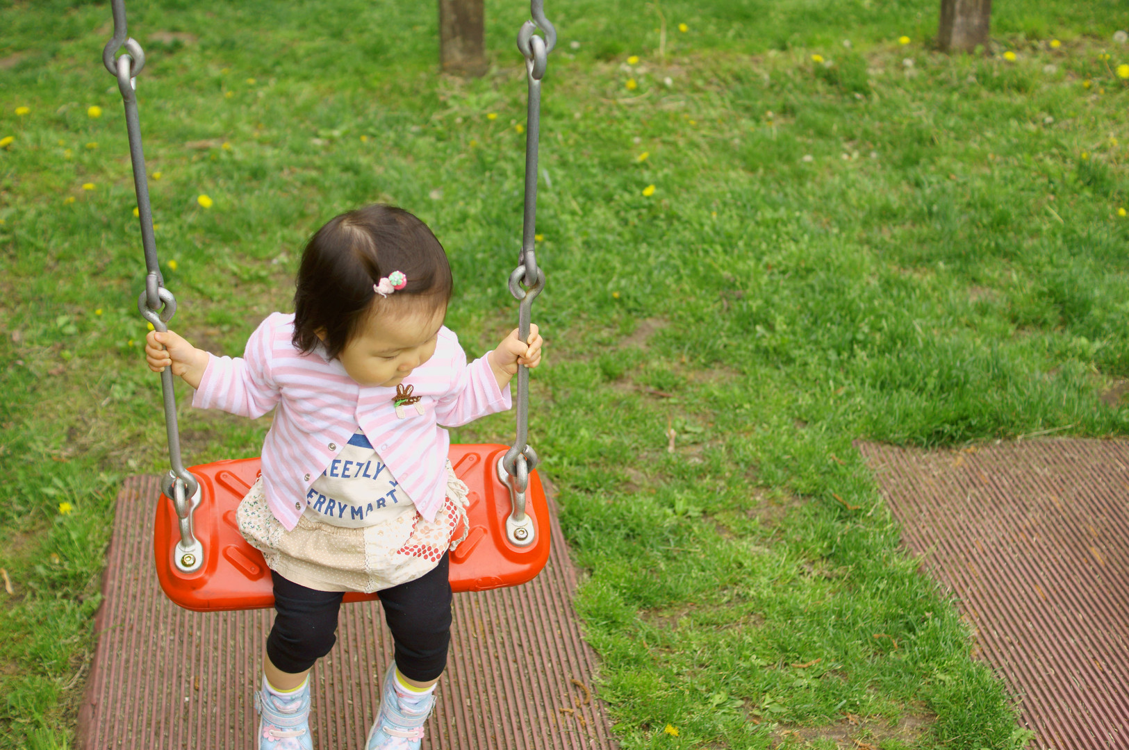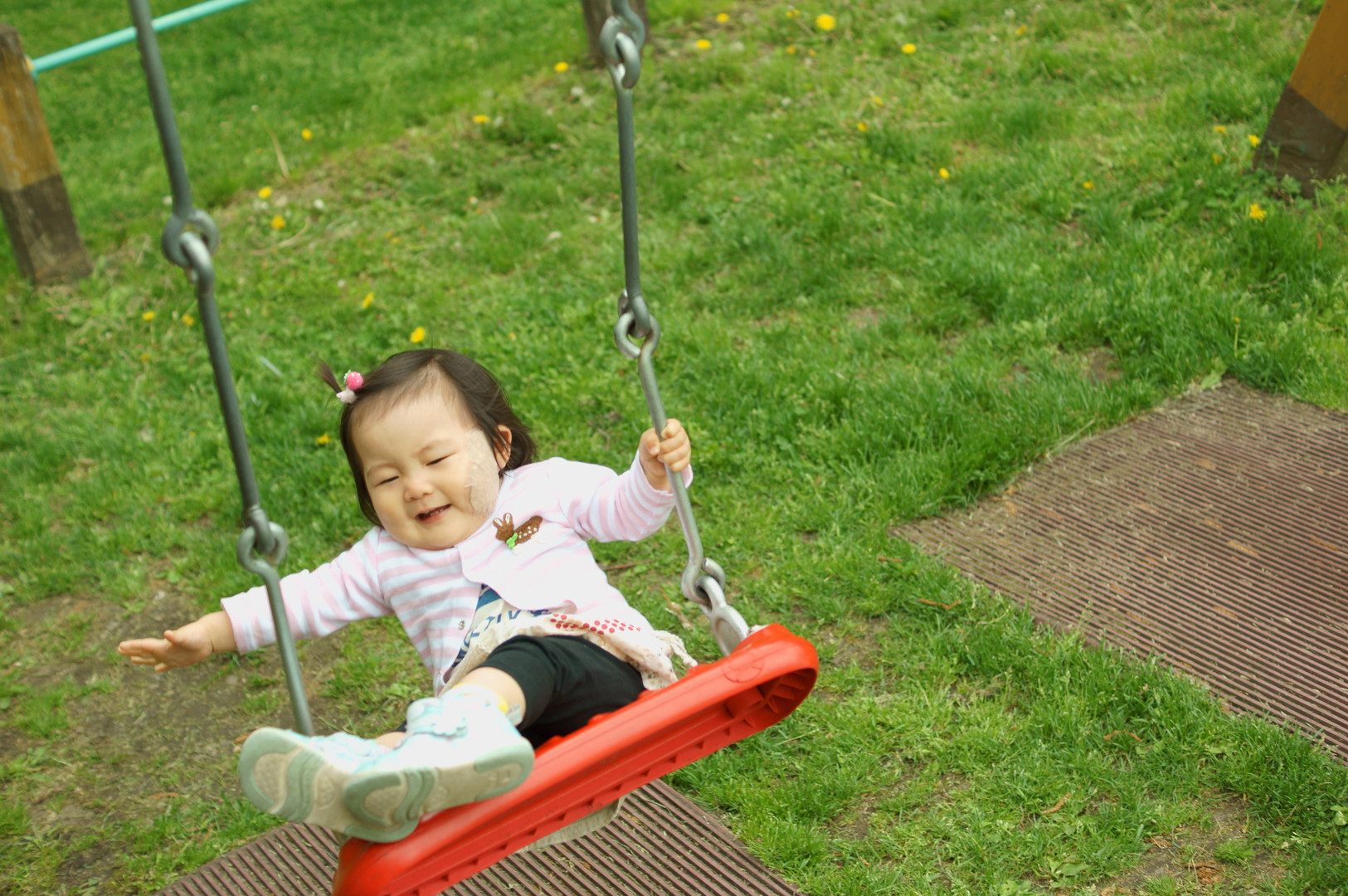 もうすぐ1歳5ヶ月 最近楽しみ方がわかってきたブランコ遊び。 想定内ではありましたが、しっかりキャッチできて一安心(笑)