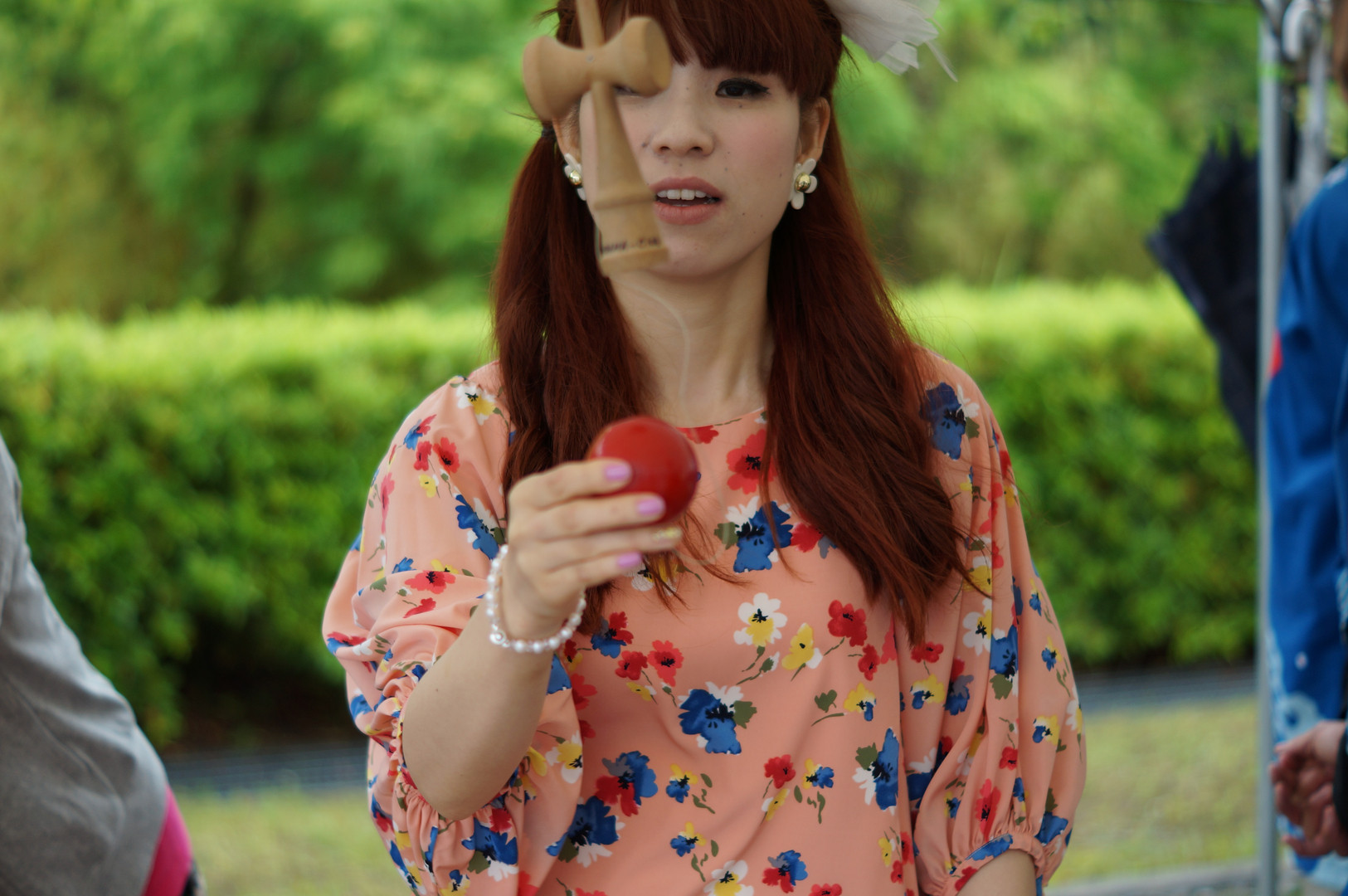 MIKKOちゃん、ステージの後 同じくステージがあったけん玉名人からレクチャー。 いきなりけん玉検定1級の灯台に(笑)