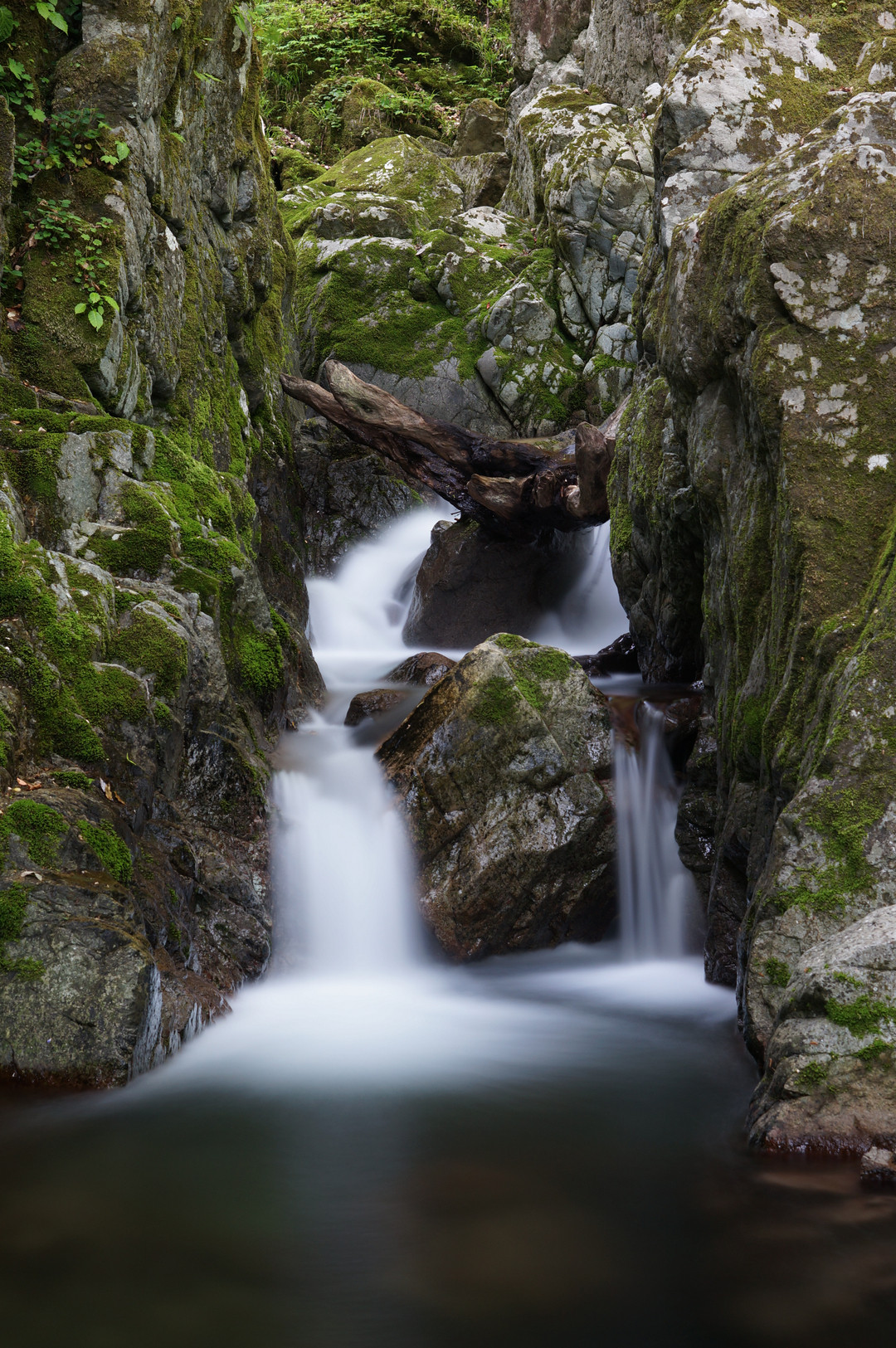 竜神滝の下流に名もない滝が数か所ある中の一つです。 大きな流木が岩に挟まって滝との共演に自然の美を感じました。