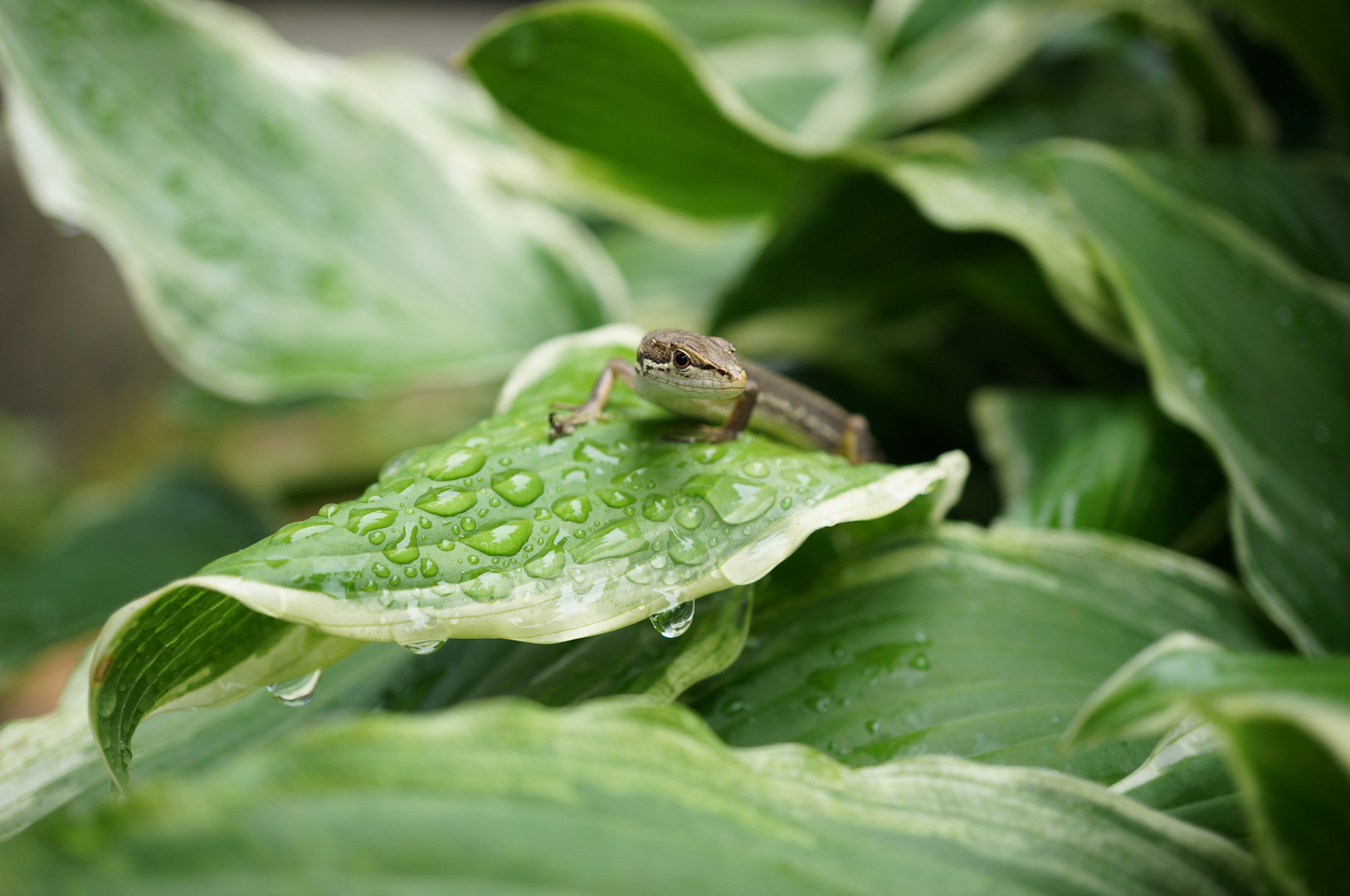 雨が上がって、アジサイを撮ろうと庭に出たらギボウシの葉の間からトカゲが出てきました。 どうも気が合いそうです。 レンズ E 30mm F3.5 Macro