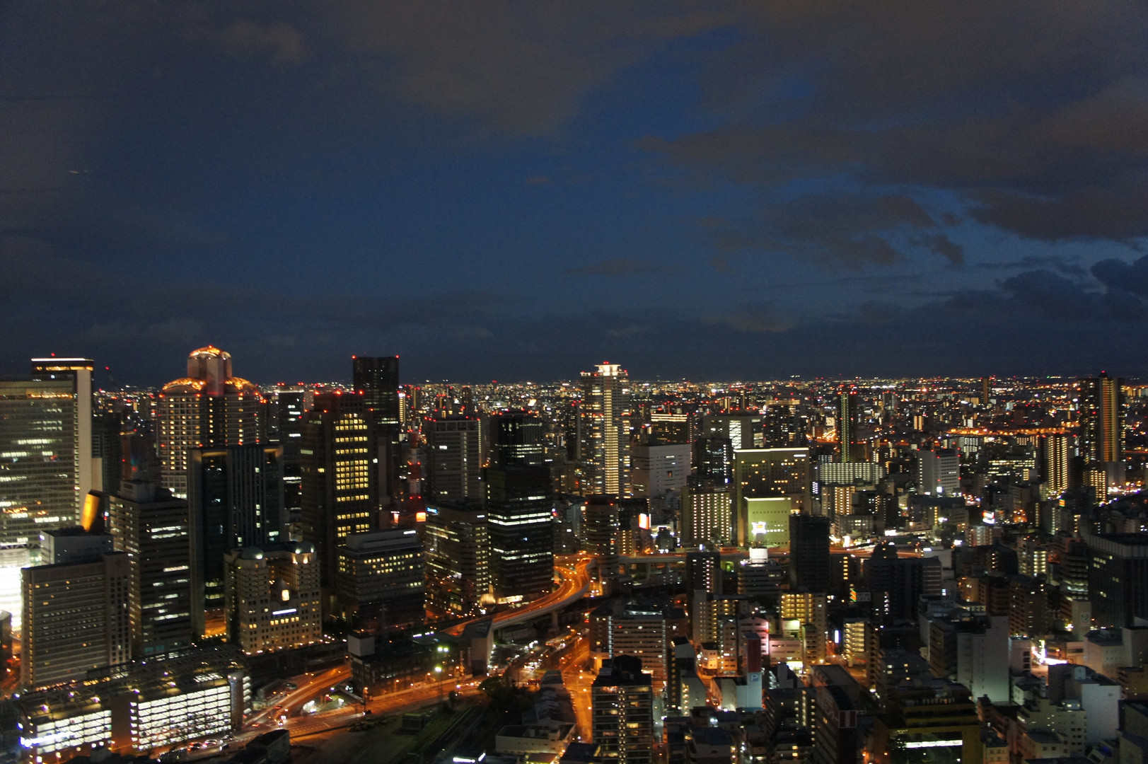 空中庭園展望台からハイキー気味に撮影しました。大阪北部から関空方向を向いています。ビルや道路の光と、暗くなりすぎない空が、動と静であるかのように見えます。