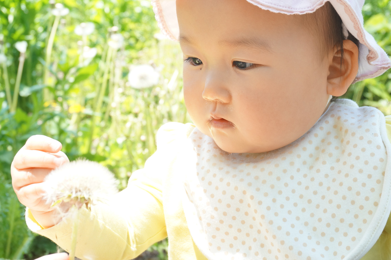 近所の遊歩道にお散歩に行った時、たんぽぽの綿毛をたくさん見つけました。 最初は恐る恐る触っていましたが、ふわふわな感触がお気に召したようでした。 夢中になりすぎてよだれが出ています。
