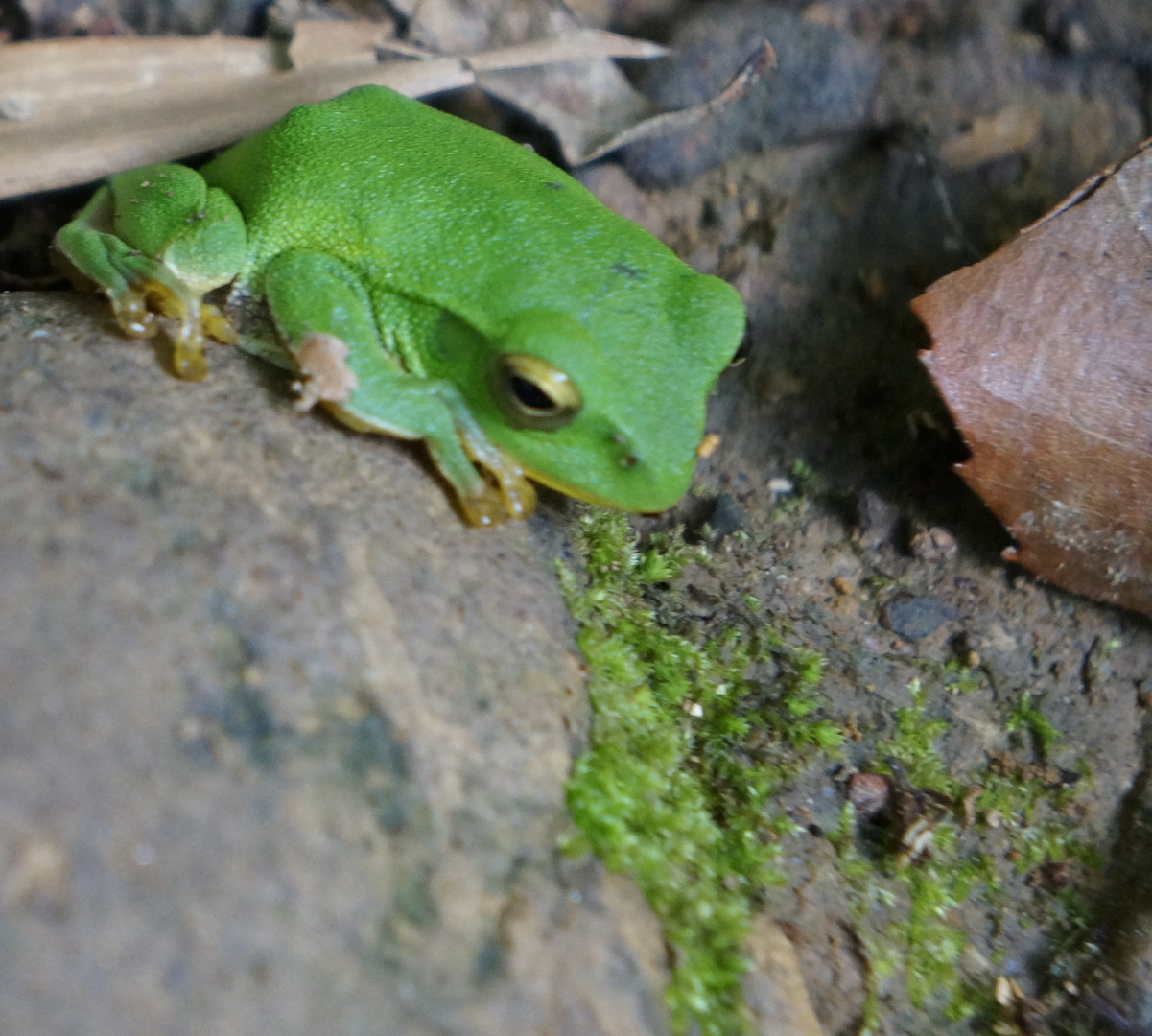 山の小径で出会いました。かくれているつもりなのか、息をひそめた感が半端なかったのですが、すごく目立ってたよ、かえる。気をつけてかえるんですよ^^
