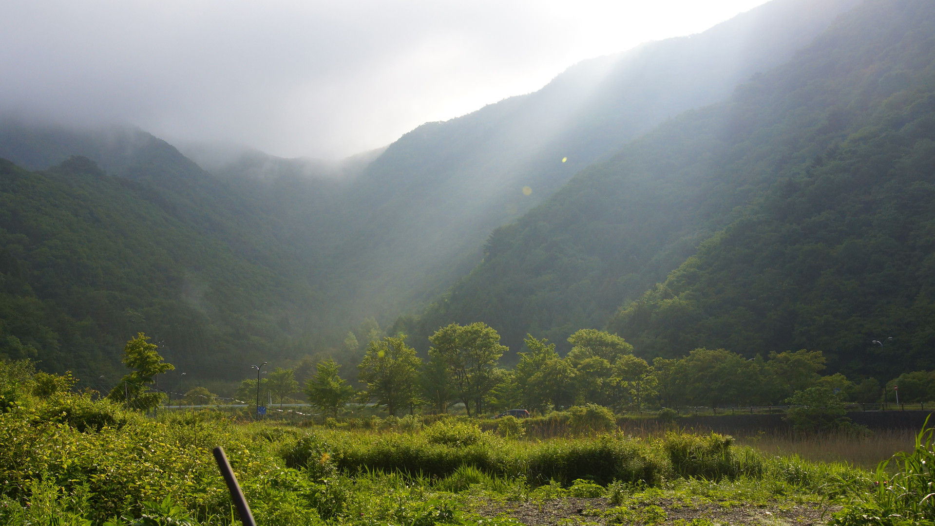 精進湖から山を振り向くと、天からの光が・・