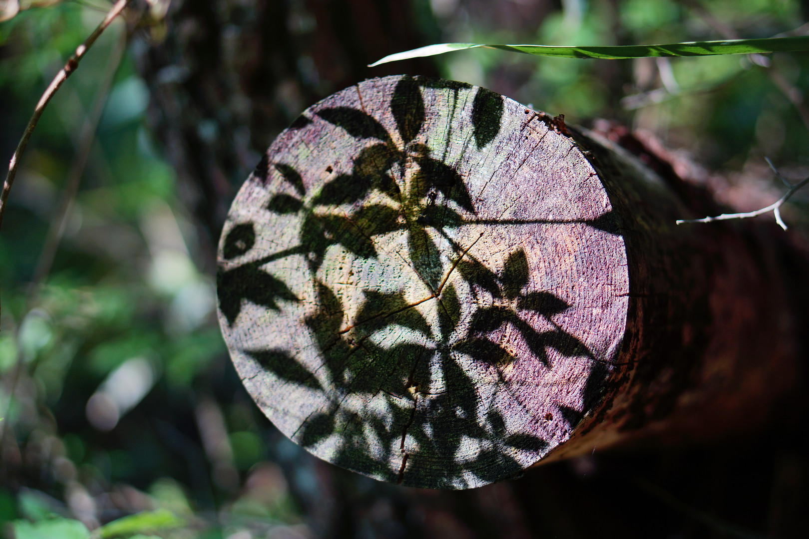 枯れ木の木口に写った葉っぱの影です(^^) 登山中に発見。