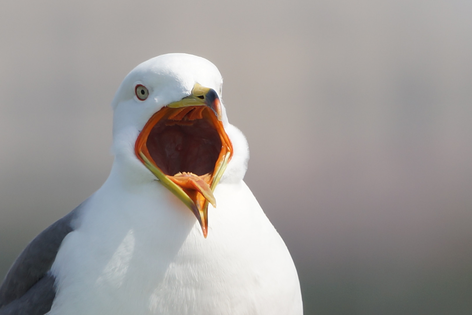 フェリー甲板の手すりへ飛来したかもめ、カメラを向けたらこのご挨拶でした。