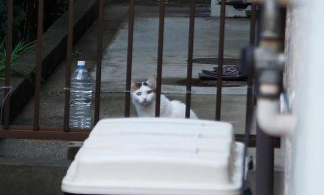 いつも庭を通る野良猫です。 いつも逃げ足が速くて、カメラに収める事が出来ませんでしたが、 今朝は待ち構えて撮影しました。 やはり安全な場所からこちらを伺っています。 (いつも走っていますが・・・) 写真は少々トリミングしています。