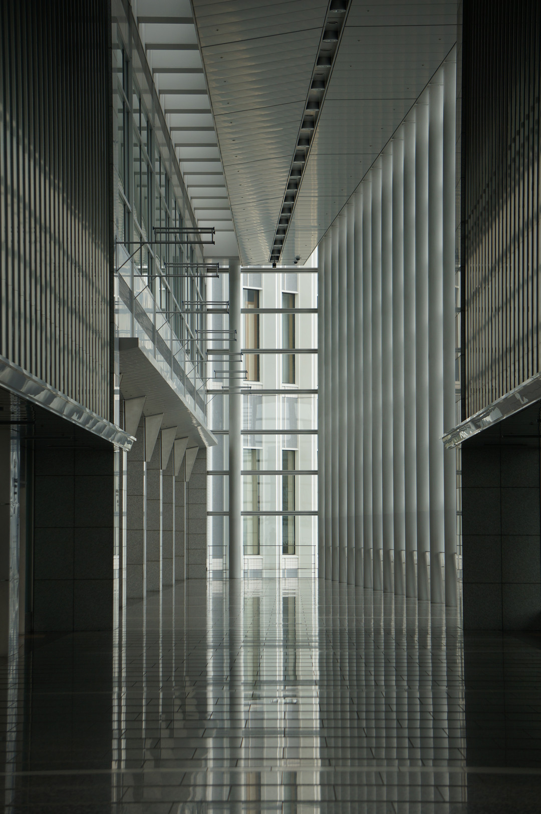 早朝のビルの中。この後雲から太陽が現れ、奥の柱の影が床に映ります。