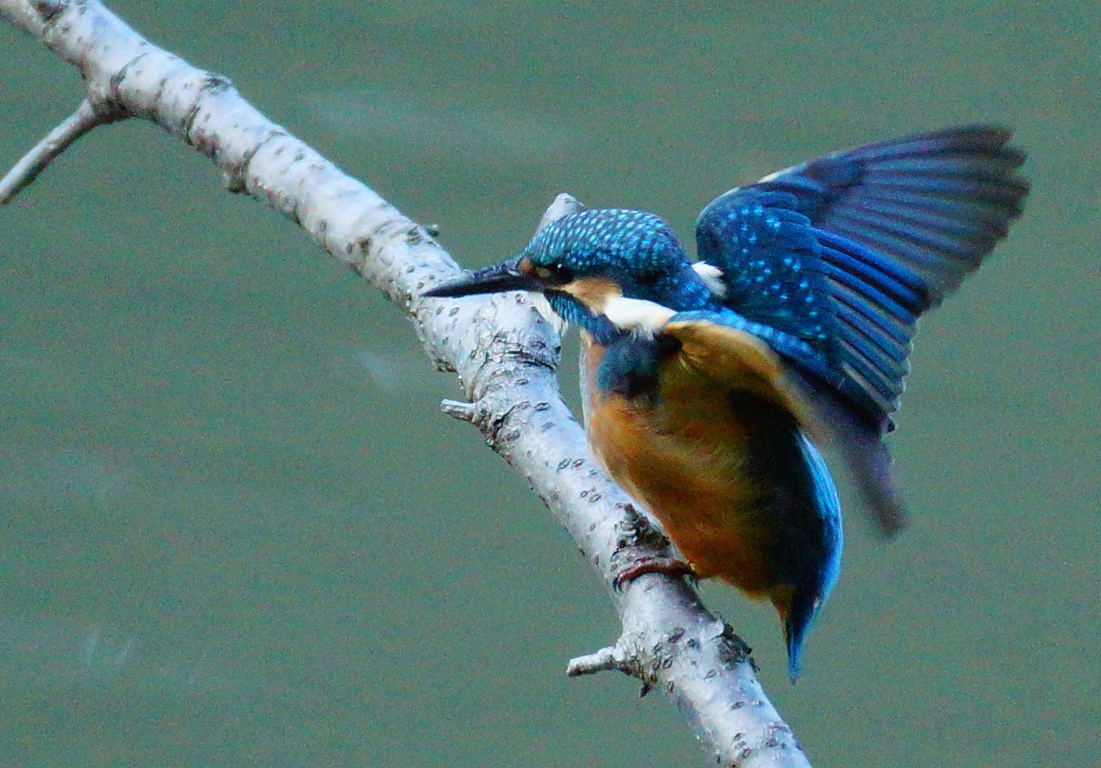 カワセミが羽を広げたところです。 もう帰ろうと思った時、飛んできてくれました。