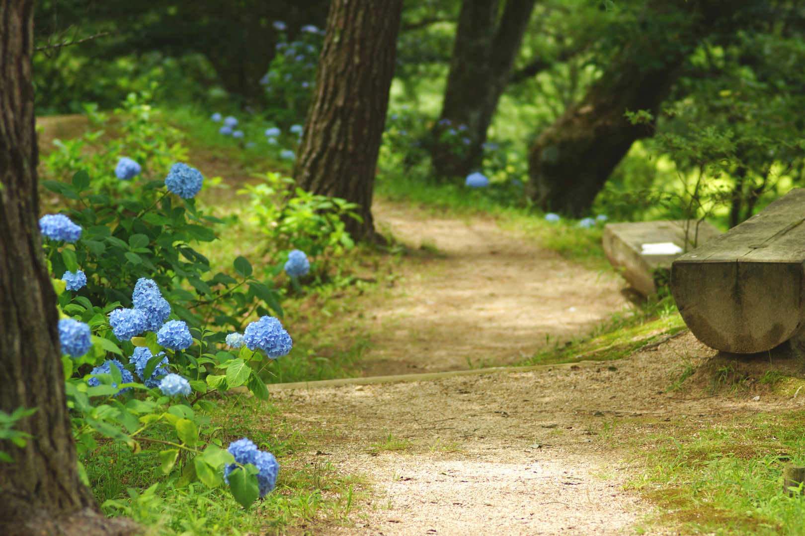 こんな通学路や通勤道があれば楽しそう。 丸太の長いすで会話が弾みます。