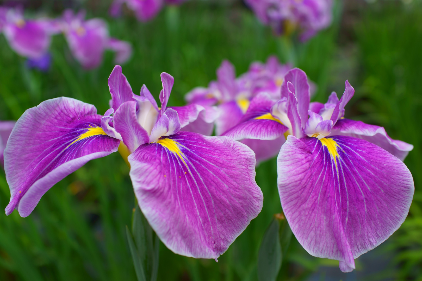 播州山崎花菖蒲園です。 緑色のバックに鮮やかな花菖蒲の色合いを美しく感じました。
