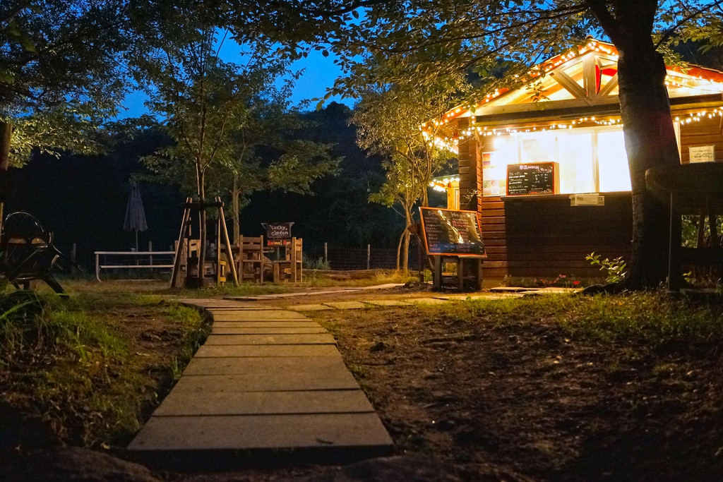ラッキーガーデンというお店のファサードです。 自然素材と電飾の組み合わせがとてもきれいでした。