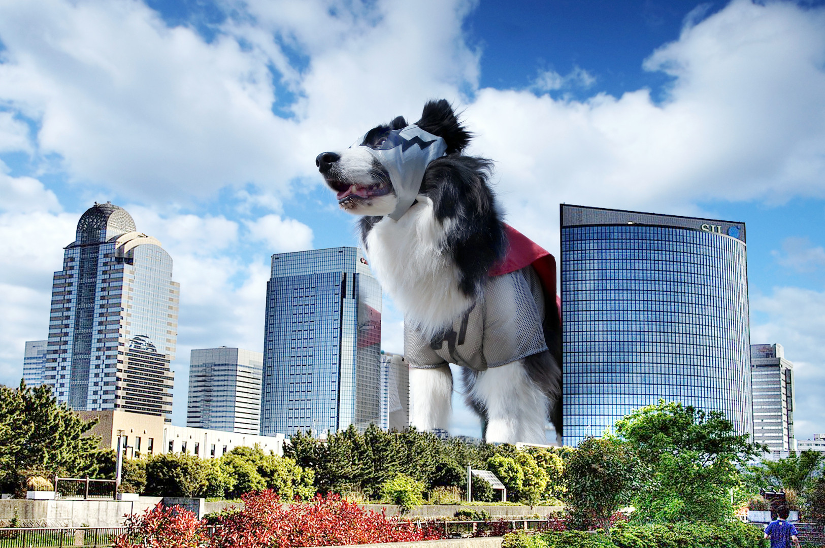 うちの愛犬のキャラクター「ブラックサンダー」とビル群と合成してみました!