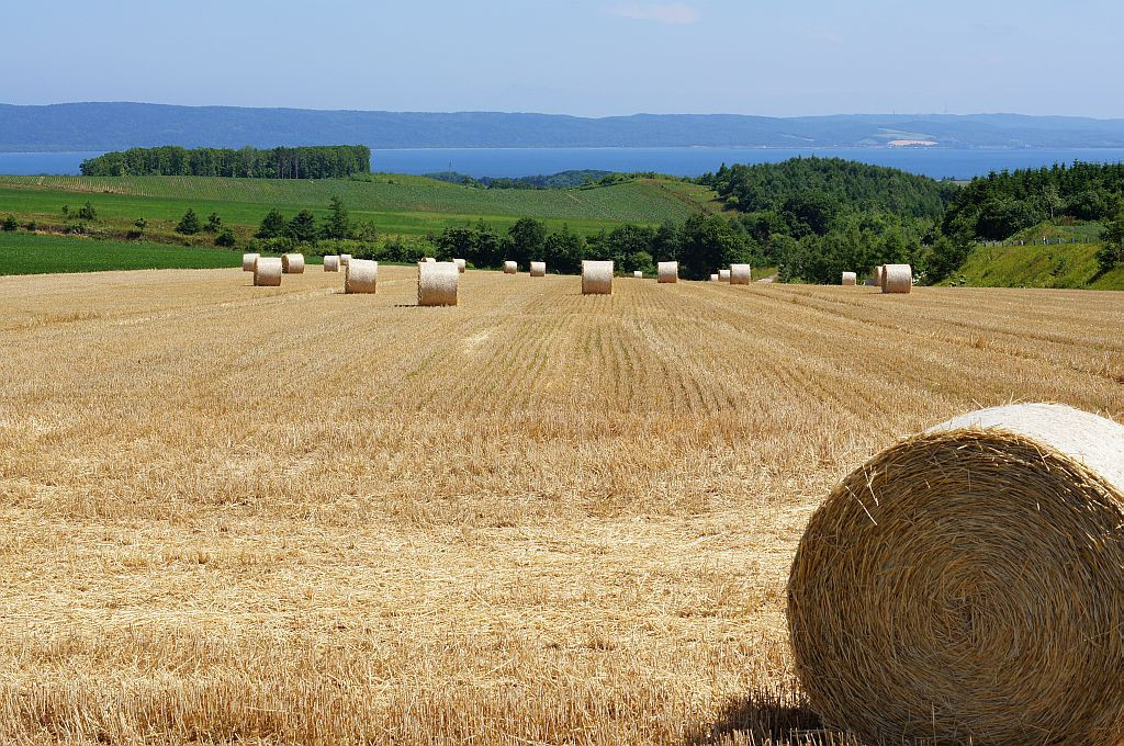 麦わらロールです。 下り坂になっているので、転がっていきそうですが、その場にとどまっています。 遠くに見える湖は、能取湖です。