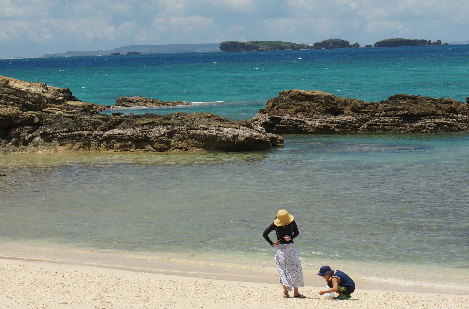 貝殻を拾う息子とスマホを見る母親、それぞれの夏 in 沖縄です。水平線が傾いているのが残念ですが、投稿します。