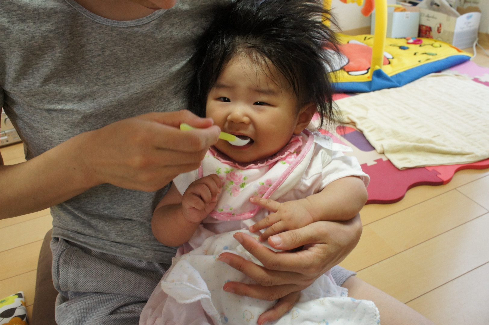 お粥を食べさせてみました。 美味しくないのかな? 嫌そうな顔してます。