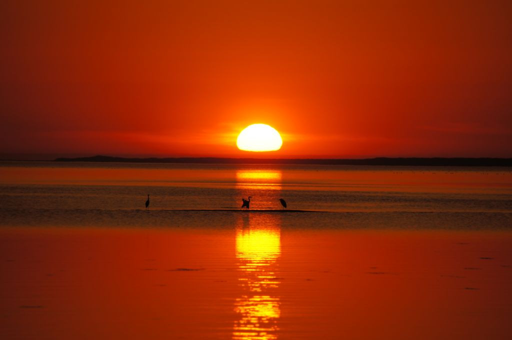 夕日が沈みゆくサロマ湖。 鳥たちもやってくる夜に向けて休む準備をしているようです。