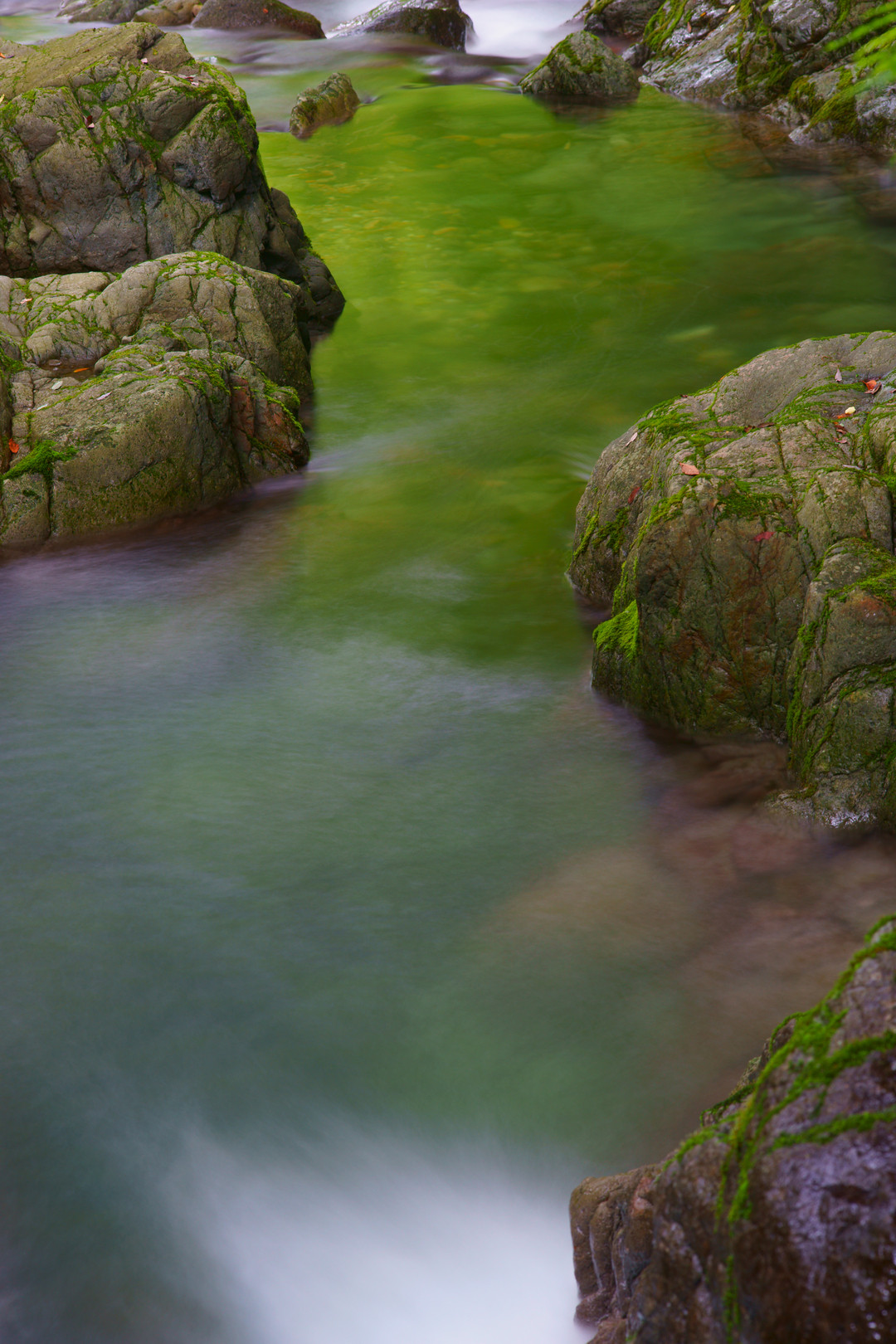兵庫県宍粟市波賀町の音水渓谷です。 清澄な渓流に木々の緑色が映り込んで「緑色の世界」を演じていました。