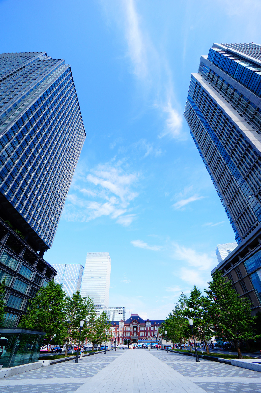 青い空の下、東京駅を囲むビルが太陽の光でとてもきれいに光っていました★
