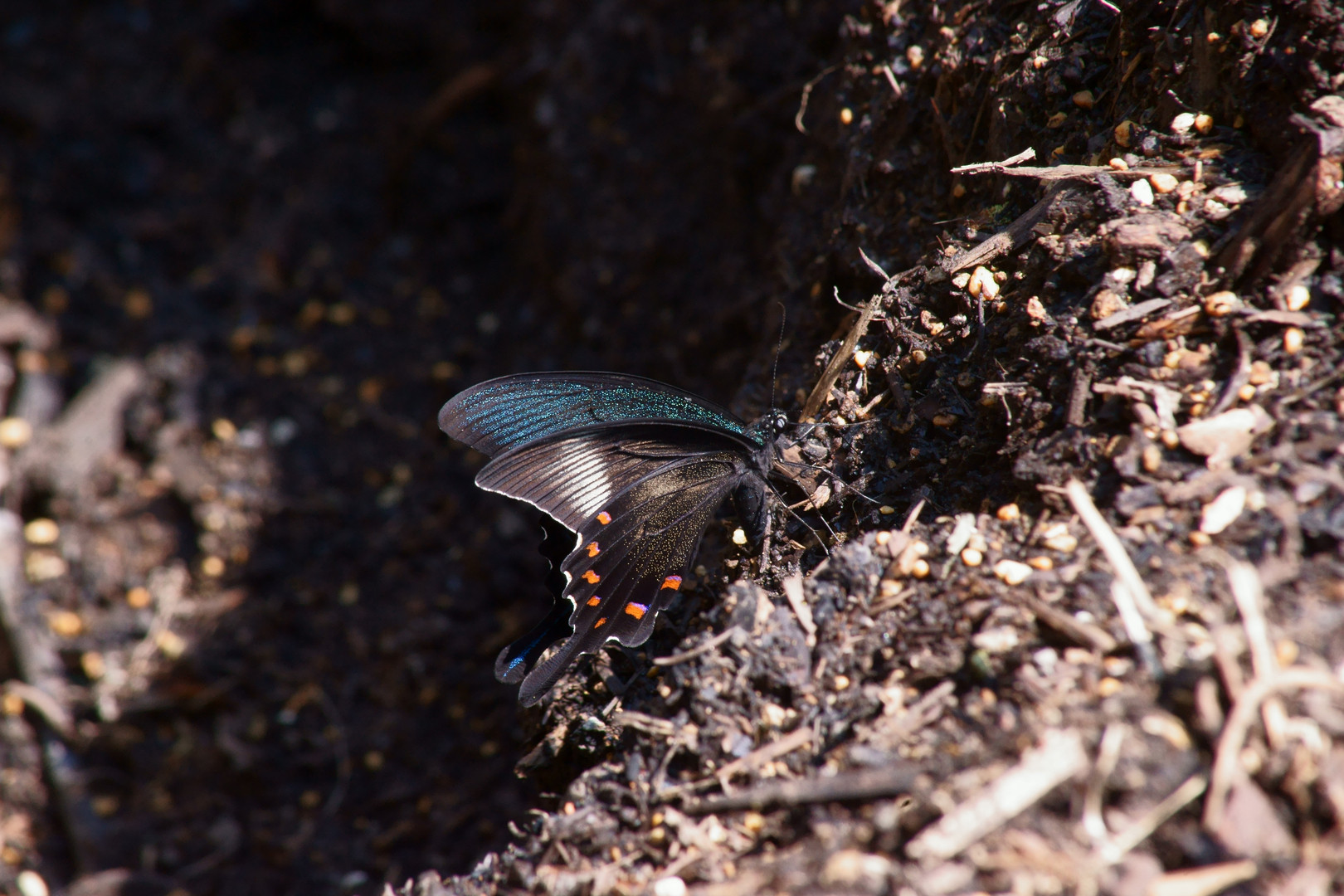 前日大雨が降り土にしみこんだ水を吸っているカラスアゲハが撮れました