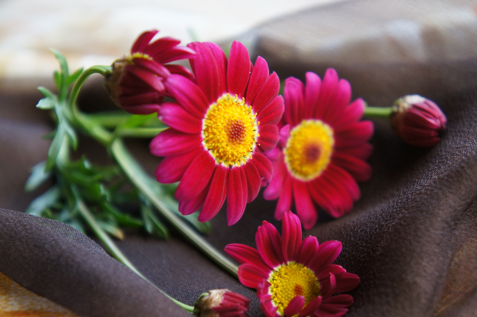 柔らかい布の質感と庭の花たちとの調和
